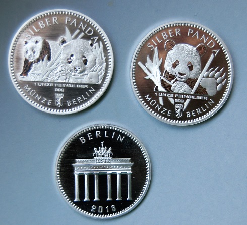 Gut bei Sammlern und solchen, die es werden wollen, sind die silbernen Panda-Medaillen im Gewicht von einer Unze bis herab zu einer sechzehntel Unze angekommen. Zu dem Set kommt noch eine Ausgabe im Gewicht von einem Kilogramm Feinsilber, erhältlich im Shop der Berliner Münzfabrik. Um Tier- und Sammlerfreunde anzuregen, jeweils neue Ausgaben zu kaufen, wird das Bild auf der Vorderseite von Jahr zu Jahr neu gestaltet. Auf dem Silberpanda von 2016 sind zwei dieser putzigen Bären, ein großer und ein kleiner zu sehen, auf der Ausgabe von 2017 erkennt man ebenfalls einen solchen beim Bambusfressen.