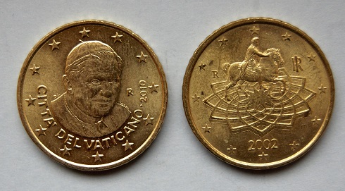 Der Vatikan nutzt auch beim Euro sein aus dem frühen Mittelalter stammendes Recht, eigene Prägungen auszugeben. Dargestellt werden auf ihnen die jeweils amtierenden Päpste, die Umschrift um das Bildnis des Heiligen Vaters lautet CITTA DEL VATICANO. Die Münzen werden in der staatlichen Prägeanstalt in Rom geprägt und sind mit einem R gezeichnet, das auch bei den italienischen Geldstücken verwendet wird. Die Zahl der auf Euro und Cent lautenden Münzen des Vatikan ist Legion, und wer sich nur auf die mit Bildnissen, Gebäuden, biblischen Szenen, Heiligendarstellungen und anderen Motiven geschmückten Geldstücke konzentriert, wird manche Mühe haben und einiges Geld ausgeben müssen, alle zusammen zu bekommen.