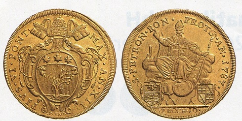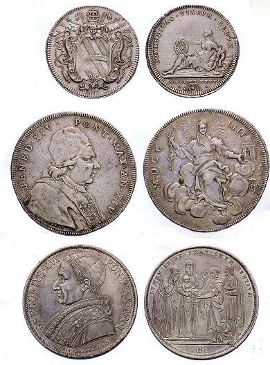 Wenn wir in die Vergangenheit blicken, dann lernen wir zahlreiche mehr oder weniger prunkvoll und spektakulär gestaltete Münzen und Medaillen mit den Bildnissen und Wappen des jeweils herrschenden Heiligen Vaters kennen. Die Anfänge der Serie waren mit flache Silberdenaren von Papst Paschalis I. bescheiden, der von 817 bis 824 regierte und ein Zeitgenosse von Kaiser Karl dem Großen war, und weiteren mittelalterlichen Kirchenoberhäuptern. Höhepunkte in der numismatischen Geschichte der Päpste sind die prächtigen Gepräge aus dem 16. bis 18. Jahrhundert, auf denen die ja immer heiß umstrittenen und häufig in politische und militärische Bedrängnis geratenen Nachfolger Petri ihre Macht und ihre Ansprüche mit Bildnissen, Wappen und religiösen Darstellungen demonstrierten. In das Gebiet fallen auch die Papstsiegel meist aus Blei. In ihrer schlichten, über die Jahrhunderte unveränderten Gestalt stets mit den Köpfen der Apostel Petrus und Paulus unterstreichen sie Tradition und Kontinuität des Papsttums.