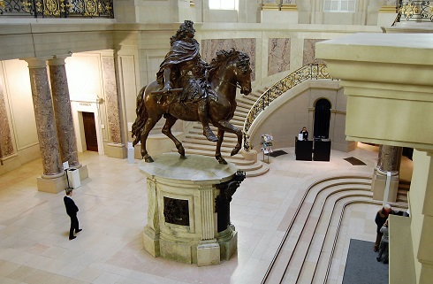 Der Rundgang durch das Bode-Museum beginnt in der überkuppelten Eingangshalle, in der eine Kopie von Schlüters Reiterdenkmal des Großen Kurfürsten Friedrich Wilhelm sowie der Abguss eines vom gleichen Künstler geschaffenen Standbildes von König Friedrich I. stehen. Der Weg geht weiter durch eine florentinische Basilika mit Gemälden, Skulpturen und Möbeln aus der italienischen Renaissance. Auf dem Rundgang geht es in eine zweite, kleinere Kuppelhalle in Formen des friderizianischen Rokoko, in der marmorne Generalsfiguren der Armee Friedrichs II., des Großen, aufgestellt sind. Eine elegante Treppe führt direkt zu dem Preußenkönig, der wie der Große Kurfürst ein bedeutender Sammler und Kunstförderer war und daher mit Bedacht in diesem großartigen Museumsschloss geehrt wird.