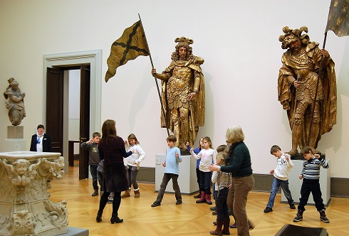Die Collage von Raum und Kunstwerken wird in den unteren und oberen Ausstellungssälen mit dem Wechselspiel von Skulpturen, Gemälden, Gobelins, Möbeln und anderen Gegenständen fortgesetzt. Alles stimmt - die auf Sockeln gestellten oder an den farbig gestrichenen Wänden befestigten Skulpturen, die immer wieder anders gestalteten Decken, die seitliche Beleuchtung, die nach alten Vorlagen wiederhergestellten Fußböden und die historischen Türeinfassungen. Wenn man Fotos von Museumsräumen aus der Kaiserzeit mit der heutigen Präsentation von Kunstwerken vergleicht, dann ist letztere sparsamer gestaltet und natürlich viel besser als damals ausgeleuchtet.