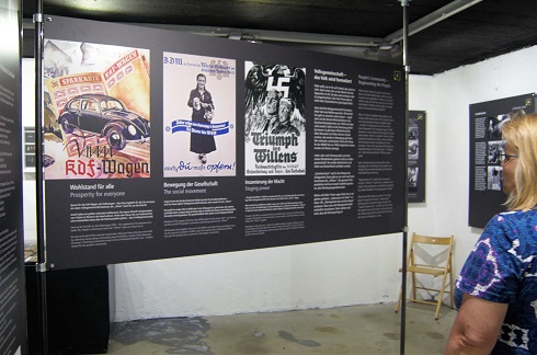Für die Ausstellung hätte kein besserer Ort gewählt werden können als der Bunker mit seinem Labyrinth aus Gängen und Räumen stets ohne Fenster. Leute, die unter Klaustrophobie leiden, sind hier fehl am Platz, und man muss gute Nerven, viel Zeit und eine Portion Vorwissen mitbringen, um mit dem schwierigen Thema klar zu kommen. Die Dokumentation in dem Gebäude, umfasst die Zeit von der Geburt Hitlers 1889 im österreichischen Braunau bis zu seinem Selbstmord am 30. April 1945 im Berliner Führerbunker unterhalb der Reichskanzlei. Gleich zu Beginn weist die Schau absurde Verschwörungstheorien zurück, nach denen sich der Diktator gar nicht erschossen, sondern in einem U-Boot nach Argentinien geflohen sein soll. Damit beantwortet dieses auch Hitlers angebliche Tagebücher erwähnende Entree weitere aus purer Dummheit resultierende Fragen, ob der Bunker hier derjenige ist, in dem Hitler seine letzten Tage verbracht habe, oder wo sich denn die Gaskammern befinden.