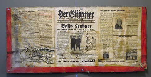 Unter den Objekten befindet sich mit Teilen eines Schaukastens, in dem das nationalsozialistische Hetzblatt "Der Stürmer" des Nürnberger Gauleiters Julius Streicher präsentiert wurde, ein ungewöhnliches Schaustück. Die vom Zahn der Zeit lädierten, aber gut lesbaren Tafeln sind mit antisemitische Parolen, Karikaturen und Spottversen bedeckt. Sie wurden 2015 auf dem Dachboden einer zum Abriss bestimmten Ausflugsgaststätte in Berlin-Schmöckwitz gefunden und der Gedenk- und Bildungsstätte Haus der Wannseekonferenz übergeben. Im Märkischen Museum ist sie nun erstmals öffentlich zu sehen. Für die jüdische Bevölkerung muss es furchtbar gewesen sein, an den überall in und außerhalb Berlins aufgestellten Stürmerkästen vorbei gehen sowie Hohn und Spott anhören zu müssen. Mit den Resten des Stürmerkastens werden in der Ausstellung bösartig entstellenden Karikaturen von Juden gezeigt, verbunden mit einem Schmähgedicht, das so beginnt: "Oh Herr schick uns den Moses wieder, / Damit er seine Stammesbrüder / Heimführet in's gelobte Land."
