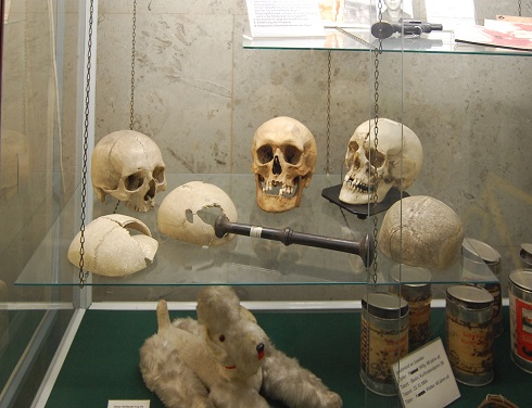 Interesse verdient die Tatsache, dass sich Mord, Totschlag und andere Verbrechen an bestimmten Standorten in Berlin öfter ereigneten als in anderen. Eine besonders berüchtigte Gegend, die von ängstlichen Naturen besser gemieden wurden, war die Umgebung des Schlesischen Bahnhofs, den wir heute als Ostbahnhof kennen. Viele auch in der Ausstellung dokumentierte Verbrechen vom Massenmord an Frauen bis zu Einbrüchen und Betrugshandlungen ereigneten sich hier, und manche Mordwerkzeuge in den Vitrinen mögen in den Mietskasernenvierteln des Berliner Ostens auf grausige Weise zum Einsatz gekommen sein.