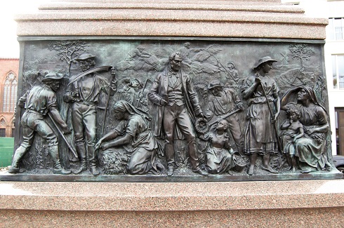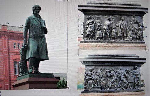 Peter Beuth leitete von 1818 bis 1845 die Abteilung Handel, Gewerbe und Bauwesen im preußischen Finanzministerium und gründete 1821 das Gewerbeinstitut, eine der ersten Fach- und Fortbildungsstätten für Gewerbetreibende in Preußen. Im gleichen Jahr rief er den Verein zur Beförderung des Gewerbefleißes ins Leben und wurde 1831 Leiter der "Allgemeinen Bauschule", der späteren Bauakademie. In all diesen Funktionen haben Beuth und Schinkel eng zusammengearbeitet, daher ist es nur zu berechtigt, dass die beiden Freunde durch das Denkmalsensemble geehrt werden. Auf den Reliefs des Beuth-Denkmals erscheinen Künstlerkollegen wie Schinkel und Rauch, ja selbst Johann Wolfgang von Goethe, der die Berliner Kunstszene aus dem fernen Weimar interessiert begleitete. Er schrieb die Widmung "Denn die Natur ist aller Meister, / Sie zeigt uns erst den Geist der Geister." Auch Alexander von Humboldt ist zu erkennen, als er gerade das Titelblatt seiner berühmten Schrift "Kosmos" erhält.