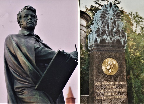 Das Denkmal steht auf einem Granitsockel, der vor einigen Jahren nach alten Vorlagen neu gestaltet wurde. Die ihn bewachenden Gebälkträgerinnen, auch Karyatiden genannt, symbolisieren die Baukunst, Bildhauerei, Wissenschaft und Malerei und weisen auf die Vielseitigkeit des großen Künstlers hin. Eine ähnliche Figur aus Bronze schmückt den Eingangsbereich des Schauspielhauses am Gendarmenmarkt, das heute als Konzerthaus bekannt ist. Eine Marmorfassung stand in der neogotisch gestalteten Friedrichswerderschen Kirche, die allerdings seit einigen Jahren wegen Schäden am Bau geschlossen ist. Da in unmittelbarer Nähe der Kirche exklusive Eigentumswohnungen entstehen und sich das Gewicht der Häuser ungünstig auf den traditionell schwankenden Baugrund auswirkt, kommt es zu Rissen im Gemäuer der Kirche. Niemand kann dertzeit sagen, wann das Gotteshaus wieder so standfest und ertüchtigt ist, dass die Staatlichen Museen dort ihren wertvollen Skulpturenschatz wieder aufstellen können.
