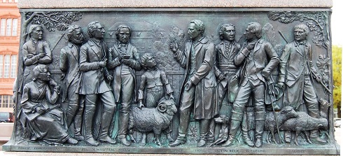 Zu den acht Mitgliedern der Technischen Deputation für Gewerbe gehörte Karl Friedrich Schinkel, der Mittlere in der bronzenen Dreiergruppe. Heinrich Drake hat ihn zeichnend dargestellt, den Blick in die Ferne gerichtet. Der Architekt der Neuen Wache, des Schauspielhauses, des Alten Museums, der Friedrichswerderschen Kirche, der Bauakademie, des Kreuzbergdenkmals und vieler anderer großartiger Bauten ging auch als Maler, Stadtplaner, Designer, Gestalter von höfischen Festlichkeiten und als Vater der Denkmalpflege in Preußen in die Geschichte ein.