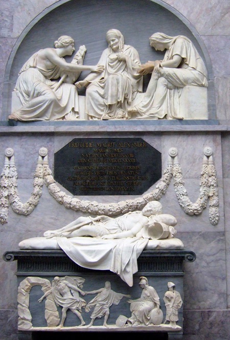 Der preußische König Friedrich Wilhelm II. war ein lebenslustiger Herr, der nichts ausließ. Mit seinen Mätressen hatte er mehrere nicht standesgemäße Kinder, um die er sich liebevoll kümmerte. Ein Sohn war ihm besonders ans Herz gewachsen - Graf Alexander von der Mark. Der mit Wilhelmine Encke-Rietz, der späteren Gräfin Lichtenau, gezeugte Knabe 1787 starb im zarten Alter von fast neun Jahren. Am Berliner Hof wurde gemunkelt, dass er vergiftet wurde, um ihn als möglichen Erben seines königlichen Vaters auszuschalten. Die wahre Todesursache für den Jungen, der kein richtiger Prinz und daher auch den Hohenzollern nicht ebenbürtig war, wird man nie erfahren. Doch steht fest, dass der im Volksmund "dicker Wilhelm" genannte Vater sehr getrauert hat. Zur Erinnerung an seinen Liebling ließ ein aufwändig gestaltetes Grabmal errichten, das in der Dorotheenstädtischen Kirche in Berlin aufgestellt wurde. Schöpfer war der Berliner Bildhauer Johann Gottfried Schadow, dem wir unter anderem die Quadriga vom Brandenburger Tor, die Marmorgruppe der aus Strelitz stammenden und mit zwei Preußenprinzen verheirateten Prinzessinnen Luise und Friederike verdanken. Das marmorne Grabmal ist eines der bedeutendsten Werke dieses Künstlers. Umfassend restauriert , befindet sich im dritten Ausstellungsgeschoss der Alten Nationalgalerie auf der Museumsinsel.