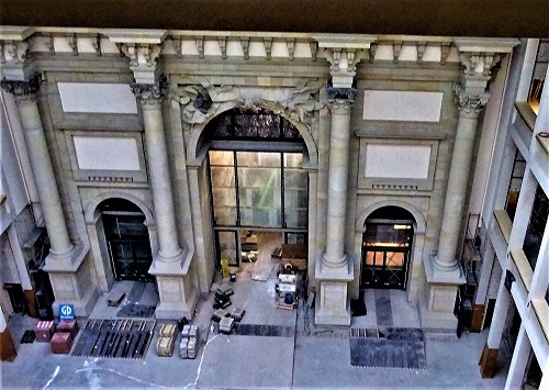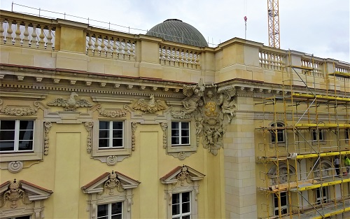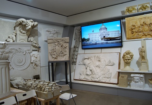 Wer dieser Tage an der Schlossbaustelle entlang geht, wird mit Vergnügen sehen, wie die Barockfassade an der Seite zum Dom und zum Lustgarten nach und nach vollendet wird. Auch an anderen, noch von Gerüsten verdeckten Seiten wird fleißig gearbeitet. Die Sicht ist frei auf die Portale IV und V, durch die man bis zur Zerstörung der Hohenzollernresidenz im Zweiten Weltkrieg und der Sprengung der Schlossruine auf Befehl der SED 1950 in den Großen Schlosshof gelangte. Die von imposanten Säulenstellungen und reichem Skulpturenschmuck geprägte Durchfahrten bildeten eine schnelle Verbindung zum Schlossplatz, auf dem früher der Neptunbrunnen stand. Lange Zeit war diese Passage öffentlich, und sie soll es auch wieder werden, sobald das Humboldt Forum, das derzeit noch eine große Baustelle ist, 2019 feierlich eröffnet sein wird. Die Vorbereitungen laufen planmäßig, die ersten Großexponate sind bereits eingetroffen. Wenn man das Portal V genauer betrachtet, sieht man beim Skulpturenschmuck eine Mischung von alten, das heißt steingrauen Partien, und neuen. Da bei der Vernichtung der Schlossruine nicht alles pulverisiert wurde und einige Spolien gerettet wurden, war es möglich, diese Kombination an der Schlossfassade anzubringen.