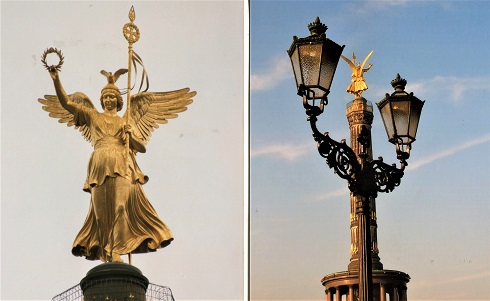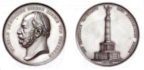 Oberhofbaurat Johann Heinrich Strack, der die Planungen übernommen hatte, fügte auf Wunsch des am 18. Januar 1871 in Versailles zum deutschen Kaiser gekürten Königs Wilhelm I. eroberte Kanonen als militärische Trophäen in den Steinschaft der Säule ein. Sie sind schon von weitem an der Vergoldung zu erkennen. Die Viktoria obenauf hält einen Siegeskranz und einen Stab in den Händen. Der Entwurf der überlebensgroßen Figur geht auf den Bildhauer Friedrich Drake zurück. Der adlergeschmückte Helm charakterisiert die Flügelträgerin als Borussia, die Personifikation Preußens. Der Stab in der linken Hand hat einen Kranz als Bekrönung, darin das Eiserne Kreuz ähnlich dem Attribut, das die Wagenlenkerin auf dem Brandenburger Tor in der Hand hält.