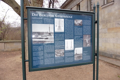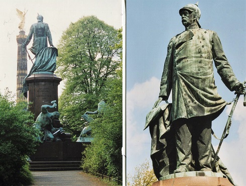 Der "Sieges- oder Kanonenspargel", wie die Berliner das Kriegsdenkmal alsbald nannten, zierte bis in die dreißiger Jahre unseres Jahrhunderts den Platz vor dem Reichstagsgebäude, der anfangs Königsplatz hieß und nach dem Ende der Monarchie in Platz der Republik umbenannt wurde. Doch wurde es 1938 gemeinsam mit dem Nationaldenkmal Otto von Bismarcks und den Denkmälern der preußischen Militärs Moltke und Roon im Zusammenhang mit Hitlers Plänen zur Umgestaltung Berlins als "Welthauptstadt Germania" abgebaut und an den Großen Stern versetzt. Wegen der neuen räumlichen Verhältnisse musste die Siegessäule um eine Trommel verlängert und auf einen höheren Unterbau gestellt werden. Daher die ungeheure Monumentalität dieser Denkmalsanlage inmitten eines stark befahrenen Kreisverkehrs. Die von Hitler und seinem Generalbauinspektor Albert Speer geplante Prachtallee mit einer Länge von sechs Kilometern und einer Breite von 120 Metern sollte auf einen 300 Meter hohen Kuppelbau mit einem Fassungsvermögen von 180 000 Menschen zulaufen. Diesen aberwitzigen Plänen wurden zahlreiche Wohnbauten geopfert, den Rest erledigten die Luftangriffe im Zweiten Weltkrieg.