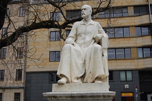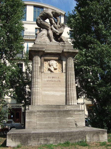 Das von dem Bildhauer Fritz Klimsch für den Karlplatz unweit der Charité geschaffene und 1910 enthüllte Denkmal zur Erinnerung an den Arzt, Prähistoriker und Politiker Rudolf Virchow verdient wegen seiner ungewöhnlichen Form besondere Aufmerksamkeit. Auf hohem säulenbestückten Sockel aus Kalkstein ringt ein nackter, muskelbepackter Mann mit einer Sphinx, dem Symbol der Krankheit. Dieses gräuliche Mischwesen aus Mensch und Tier wehrt sich heftig, doch hat es angesichts der Kraft des Menschen keine Chance. Diese Botschaft wollte der Bildhauer vermitteln. Er schuf das erste Denkmal, das auf einen stehenden oder sitzenden Professor im üblich langen Gelehrtenmantel verzichtet. Dabei handelte Klimsch auch im Sinne von Virchow, der auf vordergründige Ehrungen keinen Wert legte. Der berühmte Mediziner ist trotzdem auf dem Denkmal präsent - mit seinem marmornen Kopfrelief auf der Vorderseite und einer szenischen Darstellung auf der Rückseite, die ihn im Kreise seiner Kollegen bei der Sektion eines Toten zeigt. Die vierzeilige Inschrift darauf enthält die Widmung: "Dem großen Forscher seine Schüler. Ihrem Ehrenbürger die Stadt Berlin".