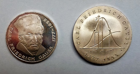 Die Bundesrepublik Deutschland und die DDR erinnerten 1977 mit unterschiedlich gestalteten Silbermünzen an den 200. Geburtstag von Gauß. Durch die Darstellung der Gaußschen Glockenkurve weicht die DDR-Münze rechts von dem sonst üblichen Schema Porträt/Staatswappen ab.