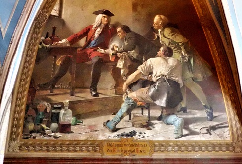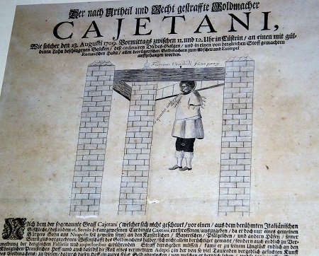 Knapp ein Jahrhundert zuvor war der erste preußische König Friedrich I. einem Goldmacher namens Cajetano auf den Leim gegangen. Nachdem der Scharlatan dem Monarchen viel Geld aus den Taschen gezogen hatte, aber kein Gramm künstliches Gold herbei geschafft hatte, wurde er 1709 aufgeknüpft. In einer Zeitungsmeldung von damals werden dem angeblichen Grafen diese Worte hinterher gerufen: "Armuth, Kranckheit und Gestanck, Rauch und Kälte zuletzt der Strick, / Zehlet in der Alchymie der Betrüger List und Tück". Ein anderer "Goldjunge", der Apothekenlehrling Johann Friedrich Böttger, hatte sich dem nach der aufwendigen Krönung in Königsberg sowie durch seine luxuriöse Hofhaltung und teure Bauprojekte in finanzielle Schwierigkeiten geratenen Herrscher schon 1701 durch Flucht nach Kursachsen entzogen. Hier kam er vom Regen in die Traufe. August der Starken, seines Zeichens Kurfürst von Sachsen und König von Polen, ließ ihn für sich als Goldmacher arbeiten, doch war das vergebliche Liebesmüh. Statt dessen ging Böttger ehrenvoll als Erfinder des europäischen Porzellans in die Geschichte ein.