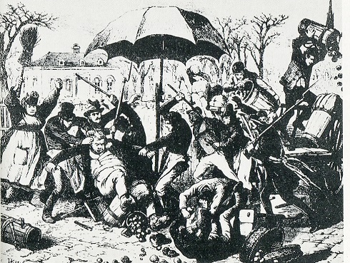 Der Revolution in Berlin vom 18. März 1848 ging der so genannte Kartoffelkrieg voran, bei dem sich die Stadtarmut mit der Polizei erbitterte Straßenschlachten lieferte. Ausgelöst wurde die Revolte durch die Missernte von 1846, durch die die Preise für Grundnahrungsmittel, vor allem für Kartoffeln und Roggen, also für Brot, stark anstiegen. Hinzu kam als Folge einer Wirtschaftskrise Arbeitslosigkeit und Kurzarbeit. Das Maß der Unzufriedenheit war voll, als Händler am 21. April 1847 auf dem Molkenmarkt und dem Gendarmenmarkt die ohnehin schon gepfefferten Preise weiter nach oben trieben und sich außerdem noch erdreisteten, die aufgebrachten Kunden zu verspotten. Das sprach sich schnell herum, und so kam es auf Märkten, aber auch vor Bäcker- und Fleischerläden zu Unruhen.