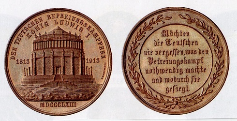 König Ludwig I. von Bayern ließ bis zu seiner durch die Affäre mit der Tänzerin Lola Montez erzwungenen Abdankung im Revolutionsjahr 1848 Denkmäler zur Erinnerung an bedeutende Ereignisse und Gestalten der deutschen und insbesondere der bayerischen Geschichte errichten oder regte deren Schaffung an. Viele dieser von hochkarätigen Künstlern geschaffenen Bauten und Figuren bezahlte er aus der eigenen Tasche und schenkte sie dem Staat. Zu den Erinnerungsmalen an die napoleonische Zeit, in der das Kurfürstentum Bayern in ein Königreich umgewandelt wurde, und die Befreiung vom napoleonischen Joch wurde zwischen 1842 und 1863 nach Plänen von Friedrich von Gärtner und Leo von Klenze die Befreiungshalle in Kehlheim, Regierungsbezirk Niederbayern, erbaut. Versehen mit der Widmung MOECHTEN DIE TEUTSCHEN NIE VERGESSEN WAS DEN BEFREIUNGSKAMPF NOTHWENDIG MACHTE UND WODURCH SIE GESIEGT ist der tempelartige Rundbau mit reichem Figurenschmuck jenen "teutschen Befreiungskämpfern" gewidmet, die tapfer und entschlossen Großes für die Überwindung des französischen Jochs geleistet haben und dafür ihr Leben gaben.
