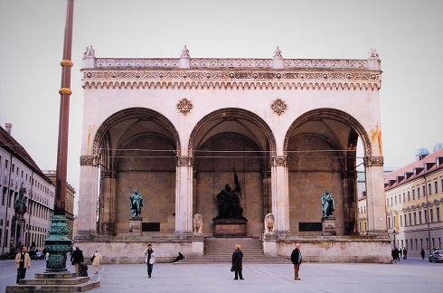 Unrühmlich ging die ebenfalls unter Ludwig I. zwischen 1841 und 1844 als südlicher Abschluss der Ludwigstraße erbaute Feldherrnhalle auf dem Odeonsplatz in die Geschichte ein. Die von Friedrich von Gärtner erbaute und nach drei Seiten offene Halle mit einer Freitreppe wurde nach der Loggia dei Lanzi in Florenz nachempfunden. Sie ist im Inneren verdienstvollen Befehlshabern der bayerischen Heere gewidmet und mit Bronzestatuen der bayerischen Feldherren Tilly und Wrede (Bildhauer: Ludwig von Schwanthaler), einem Armeedenkmal (von Ferdinand von Miller d. J.) und auf der Treppe mit zwei Löwen aus Marmor geschmückt. Auch dieses für fast eine Viertelmillion Gulden erbaute Ehrenmal wurde vom König dem bayerischen Staat geschenkt. Nach dem "Marsch auf die Feldherrnhalle", dem gescheiterten Puschversuch des Führers der NSDAP, Adolf Hitler, und seiner Anhänger am 9. November 1923 avancierte das an italienischen Vorbildern orientierte Gebäude zu einer Kultstätte der Nationalsozialisten, die jenen Demonstrationszug in den Jahren ihrer Schreckensherrschaft stets am 9. November symbolisch wiederholten. Hitler wurde nach dem Putschversuch zu fünf Jahren Festungshaft verurteilt, musste aber nur acht Monate in Landberg verbüßen und verfasste in dieser Zeit seine Hetzschrift "Mein Kampf".