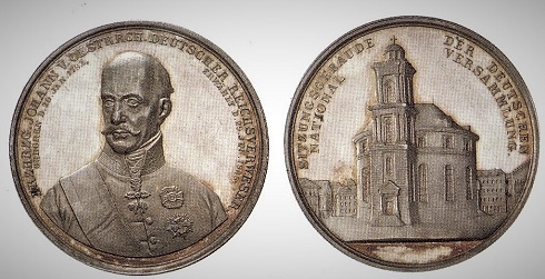 Die Paulskirche wurde seit 1789 nach Abbruch der baufälligen Barfüßerkirche nach Plänen von Andreas Liebhardt als evangelisch-lutherische Hauptkirche der Freien Reichsstadt Frankfurt am Main in regionaltypischem Rotsandstein erbaut und 1833, nach mehreren Unterbrechungen, von dem Stadtbaumeister Johann Friedrich Christian Hess in klassizistischem Stil vollendet. Dem runden Kuppelbau ist ein hoher Turm angefügt, links und rechts vom Eingang hat die Stadt Frankfurt 1898 anlässlich des 50. Jahrestags der Eröffnung der Deutschen Nationalversammlung Gedenktafeln anbringen lassen, die die geschichtliche Rolle des ersten frei gewählten deutschen Parlaments für die Herstellung der deutschen Einheit und demokratischer Verhältnisse würdigen. In der Mainmetropole konnte 1848 und 1849n die Volksvertretung vor politischen und militärischen Eingriffen jener Feudalmächte sicher sein, denen die Versammlung gegen den Strich ging und die sich von ihm nicht das kleinste Stückchen Macht nehmen lassen wollten.