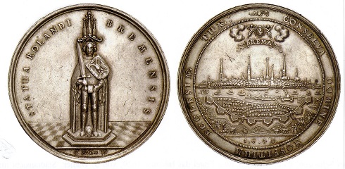Die Bremer liebten ihren Roland so sehr, dass sie ihn in der Barockzeit und auch später auf Medaillen darstellten. Noch während des Dreißigjährigen Krieges (1618-1648), dem bis dahin schrecklichsten aller Kriege mit verheerenden Folgen für das römisch-deutsche Reich und umliegende Länder, wurde eine prächtige Medaille mit der Ansicht der "Statua Rolandi Bremensis" und dem Panorama der durch einen Festungswall geschützten Hansestadt geprägt. Mit ihr schuf der Stempelschneider Johann Blum ein numismatisches Denkmal, das seinesgleichen sucht. Denn es war zu seiner Zeit ungewöhnlich, dass man ein aus dem Mittelalter stammendes Architektur- und Kunstdenkmal auf einer Barockmedaille darstellte. Das unterstreicht das Geschichts- und Traditionsbewusstsein derer, die Blum den Auftrag für diese Medaillegaben. Versehen mit der Bitte an Gott um Schutz und Beistand, kommt sie in verschiedenen Versionen und auch in Form von Abschlägen aus Gold vor. Das unterstreicht die Beliebtheit der Prunkprägung und ihre Verwendung wohl auch zu Geschenk- und Auszeichnungszwecken. Auch später diente der Bremer Roland immer wieder als Medaillenmotiv.