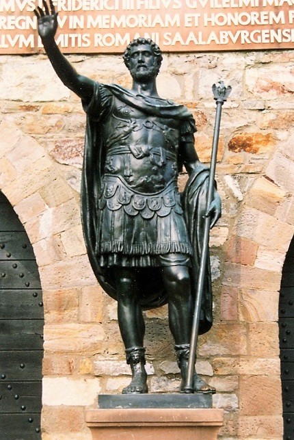 Der antiken Vorbildern nachempfundene Statue des Kaisers Antoninus Pius lädt grüßend die Besucher in das Kastell Saalburg ein.
