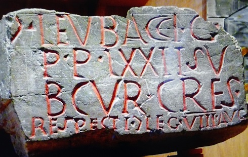 In der Ausstellung wird das Leben in einem Römerkastell, wie Saalburg eines war, anhand von originalen Fundstücken wie diese Inschriftenplatte und rekonstruierten Gegenständen geschildert.