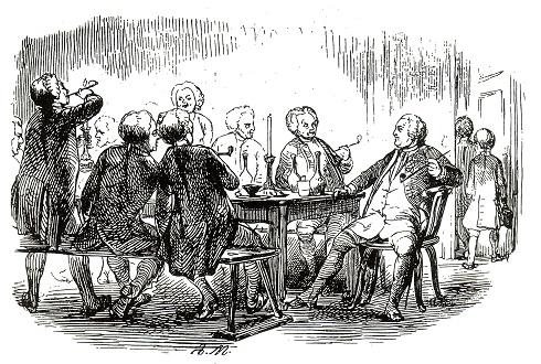 Deftig ging es bei Sauf- und Rauchgelagen im 17. und 18. Jahrhundert zu. Beim Tabakskollegium des Soldatenkönigs fühlte sich Friedrich Wilhelm I. als gleicher unter gleichen, die Prinzen mussten antreten und wurden, wie der Holzstich von Adolph Menzel rechts zeigt, hinaus geschickt. Der spätere König Friedrich II. behielt diese Zusammenkünfte Zeit seines Lebens in unangenehmer Erinnerung.