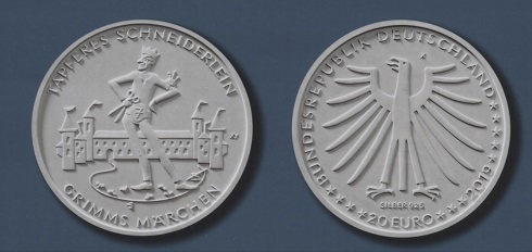 Die für 2019 angekündigte neue Zwanzig-Euro-Münze aus der beliebten Serie "Grimms Märchen" setzt dem Glückspilz ein schönes numismatisches Denkmal. Sie folgt dem bekanten Märchen vom Froschkönig, das 2018 mit einer Gedenkmünze bedacht wurde. Den Entwurf der Berliner Designerin Marianne Dietz hat die Jury mit dem ersten Preis ausgezeichnet und so beschrieben: "Im Motiv des Siegerentwurfs wird das tapfere Schneiderlein aus der Perspektive des Endes der Geschichte dargestellt. Die Figur trägt sowohl Attribute ihres ursprünglichen Handwerks als auch die Krone als Symbol der erlangten höchsten Stellung." Die Darstellung verliere sich weder in Einzelelementen des Märchens noch in traditionellen Sujets. Dem Bundesadler auf der Rückseite bescheinigt das Preisgericht, er harmoniere in der künstlerischen Ausarbeitung perfekt mit der Bildseite.