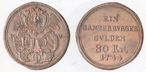 Die Nürnberger Bürgergulden zu 80 und 40 Kreuzer bilden in der Serie eine Ausnahme. Sie sind keine wirklichen Münzen, mit denen man normal bezahlen konnte, sondern Wertmarken und Beweismittel dafür, dass ein Bewohner der alten Reichsstadt seine Steuern entrichtet hat. Auf einem von dem bekannten Graveur Peter Paul Werner geschaffenen und auf einer Spindelpresse geprägten Bürgergulden aus Kupfer erkennt man wie auf den üblichen Gold- und Silbermünzen das dreifache Stadtwappen in Kombination mit einer Zweckinschrift und der Jahreszahl 1744. In seinem Buch "Die Münzen der Reichsstadt Nürnberg" (Stuttgart 1991) schreibt Hans-Jörg Kellner, die Existenz dieser Gepräge hänge mit den besonderen Verhältnissen der Steuererhebung in Nürnberg zusammen, und sie hätten eine Stellung zwischen Münze und Marke inne gehabt.