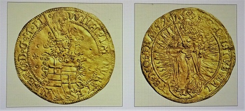 Auf dem hier abgebildeten Goldgulden des Ordensmeisters Wilhelm von Fürstenberg ist die Madonna mit den Christuskind auf einer Mondsichel stehend dargestellt, umgeben von der aus dem Lateinischen übersetzten Umschrift "Christus ist unser Heil". Über dem mit zwei Kreuzen geschmückten Wappenschild ist der Ordensmeister mit geschultertem Schwert abgebildet, ein Mann, der den im Verfall begriffenen Ordensstaat gegen russische Truppen nicht zu schützen vermochte. Im Jahr 1558 begann der russische Zar Iwan IV., genannt der Schreckliche, mit der Eroberung Livlands. Der in Bedrängnis geratene Ordensmeister, der auf der Münze MAGISTER LIVONIAE genannt wird, geriet in russische Gefangenschaft und wurde in die Nähe von Moskau deportiert. Nach und nach wurde der Deutsche Orden als Machtfaktor im Ostseeraum ausgeschaltet.