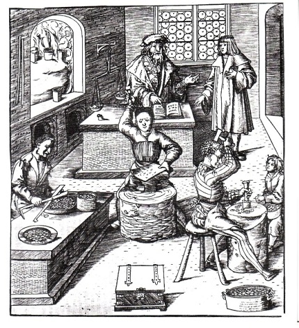 Der junge Maximilian lässt sich von einem Münzmeister zeigen, wie Geld hergestellt wird. Der Holzschnitt stammt aus dem "Weiskunig", in dem Leben und Taten Kaiser Maximilians I. geschildert werden.