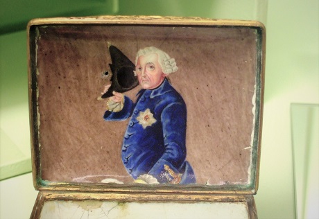 Friedrich II. kam billig in den Besitz der Porzellanmanufaktur, die als KPM weltberühmt wurde. Dargestellt ist der Monarch auf der Innenseite einer Porzellandose im Besitz der Stiftung Stadtmuseum Berlin.