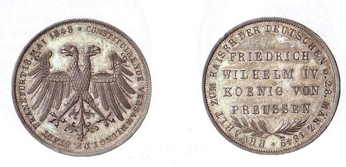Bei der Frankfurter Nationalversammlung hätte man eigentlich wissen müssen, wie der erzkonservativ denkende, am Gottesgnadentum seiner Herrschaft und am feudalen Ständestaat eisern festhaltende Monarch zur Kaiserfrage steht. In der Stadt am Main allerdings wurden in der Erwartung einer positiven Antwort schon Münzen und Medaillen geprägt, die Friedrich Wilhelm IV. mit der Formulierung "Erwählt zum Kaiser der Deutschen" feiern. Die Auflage dieser Doppelgulden ist gering, ab und zu werden sie im Münzhandel angeboten und erzielen je nach Erhaltung stattliche Preise.