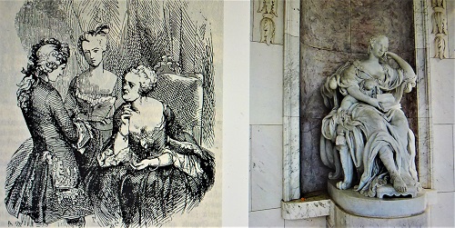 Markgräfin Wilhelmine hatte es an der Seite ihres Gemahls nicht leicht. Den Umzug von Berlin und Potsdam nach Bayreuth, in die fränkische Provinz, hat die Königstochter als gesellschaftlichen Abstieg empfunden. Ein wenig kommt das Unglück im Leben der mit vielen guten Gaben ausgestatteten Frau in der nachdenklichen Haltung zum Ausdruck. Wilhelmine sitzt in einer Nische auf einem Sessel und schaut, von einem Buch aufblickend und den Kopf in die linke Hand gestützt, aus dem Freundschaftstempel hinaus in den Park. Der kleine Hund in der rechten Armbeuge wird als Sinnbild für Treue gedeutet, eine Tugend, die ihrem Gemahl ganz und gar fehlte. Das Kostüm mit Hermelinbesatz unterstreicht den hohen Rang der Markgräfin, ein aus dem Kleid hervor schauender Fuß ist nach antiker Manier gegürtet.