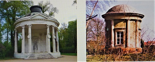 Der Freundschafts- und der Antikentempel sind überkuppelte Rundbauten. Der eine ist als offene Säulenhalle gestaltet, der andere vermauert und mit Fenstern versehen. Indem Friedrich II. im Freundschaftstempel das marmorne Sitzbild seiner Lieblingsschwester Wilhelmine aufstellen ließ, verlieh er ihm Denkmalcharakter. Die Gebrüder Johann David und Lorenz Wilhelm Räntz, die die 1758, mitten im Siebenjährigen Krieg, verstorbene Markgräfin noch gekannt hatten, orientierten sich bei der Gestaltung der Marmorfigur an einem Gemälde von Antoine Pesne aus dem Jahre 1750. Vor einigen Jahren wurde der Freundschaftstempel saniert und restauriert. Die Sitzfigur der Markgräfin wurde 1998 durch eine Kopie ersetzt, weil das Original stark angegriffen war und nicht mehr vandalischen Angriffen ausgesetzt werden sollte.