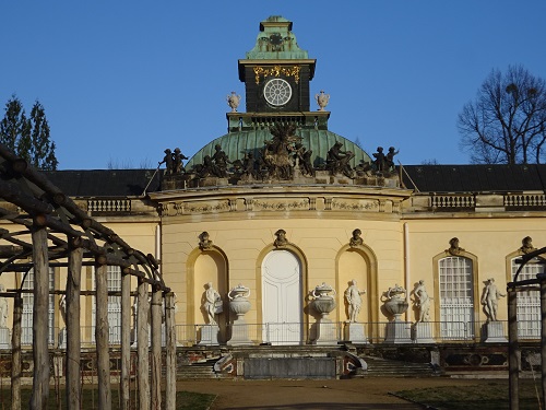 Die Potsdamer Gemäldegalerie hat ein Pendant, das wir als Neue Kammern kennen. Dieses Bauwerk links vom Schloss Sanssouci hatte einen Vorgängerbau, die 1747 erbaute Orangerie. Nach Plänen Georg Wenzeslaus von Knobelsdorffs unter Leitung von Jan Bouman errichtet, beherbergte das Gebäude in der kalten Jahreszeit empfindliche Kübelpflanzen, die die Terrasse von Schloss Sanssouci schmückten. Der Besitz und die Pflege solcher exotischen Gewächse gehörte unbedingt zu einer fürstlichen Hofhaltung, wie sie auch von Friedrich II. gepflegt wurde. Die gewellten Rampen, auf denen die schweren Gefäße mit den Orangen, Palmen und was sonst noch des Königs Auge erfreute, gibt es noch heute. Die horizontale Gliederung der Neuen Kammern wird durch eine Figurengruppe über dem Mittelrisalit gebrochen. Friedrich Christian Glume schuf eine Wappenkartusche, über deren Rand Chronos, der antike Gott der Zeit und der Lebenszeit blickt. Zu erkennen ist eine Weltkugel mit Alchimistenzeichen der Metalle, die als Anspielung auf das Freimaurertum Friedrichs II. und die Gründung der "Loge zu den drei Weltkugeln" gedeutet werden.