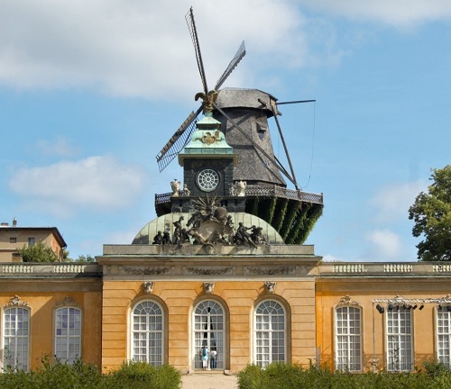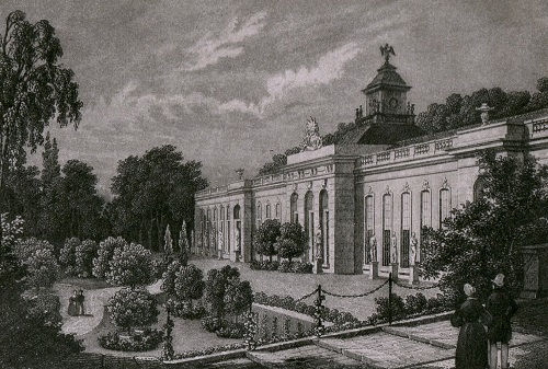 Friedrich II. war ein eifriger Bauherr sowie Bilder- und Skulpturensammler. Für seine Kunstschätze ließ der könig von Preußen rechts vom Schloss Sanssouci zwischen 1755 bis 1763 nach Plänen von Johann Gottfried Bühring eine Galerie errichten und gestattete, wenn er nicht anwesend war, "anständig" gekleideten Besuchern gegen einen kleinen Obolus Einlass. Über den Fenstern des von der Decke bis zum Fußboden mit Bildern ausgestatteten Prachtbaues schauen 20 berühmte Maler und Bildhauer in der Form von Schlusssteinen auf die Betrachter hinab. Diese ungewöhnliche Art der Fassadendekoration macht das Gebäude, die früheste Gemäldegalerie weit und breit, über seinen eigentlichen Zweck, die königlichen Bilderschätze zu präsentieren, auch zu einem Ehrenmal für berühmte Künstler, die zum Teil in den Sammlungen der Hohenzollern vertreten waren. Gewürdigt werden unter anderem die Maler Lucas Cranach, Albrecht Dürer, Antonius van Dyck, Raffael, Peter Paul Rubens sowie der griechische Bildhauer Phidias. Im Zusammenhang mit der Gründung der Königlichen Museen wurden Anfang des 19. Jahrhunderts mehrere Gemälde der Potsdamer Galerie entnommen und nach Berlin in dem von Schinkel erbauten und 1830 am Lustgarten eingeweihten Alten Museum neu präsentiert.