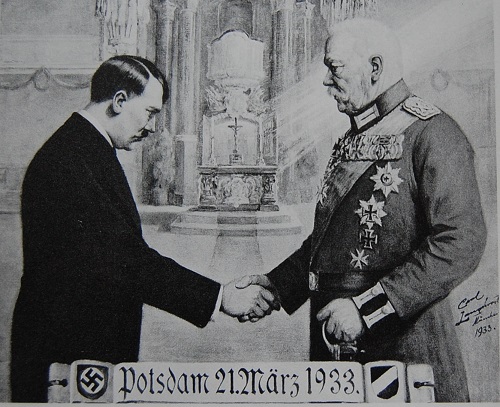 Am 21. März 1933 inszenierte Joseph Goebbels den auch im Rundfunk landesweit übertragenen so genannten Tag von Potsdam, an dem Reichspräsident Paul von Hindenburg in einer feierlichen Zeremonie in der Potsdamer Garnisonkirche die Regierungsmacht an den Führer der NSDAP und neuen Reichskanzler Adolf Hitler. Die vom Propagandaminister gleichgeschaltete und kommandierte Presse beschwor mit markigen Worten und martialischen Bildern von Ansprachen und Paraden die "Einheit von alter Kraft und neuer Größe". Zu dem Staatsakt waren Hohenzollernprinzen sowie hochrangige Militärs und andere Vertreter des altpreußischen Staates erschienen. Deren Beteiligung an dem Spektakel kam der Naziführung gelegen, denn sie konnte damit Weise demonstrieren, dass ihr Regime auf preußischen Traditionen wie Gottvertrauen, Treue zu Volk und Staat, aber auch Verlässlichkeit, Ordnung und Pünktlichkeit beruht und sich damit fundamental von der Weimarer Republik unterscheidet, die von den Nazis und der extremen Rechten als chaotisch und marxistisch verseucht verteufelt wurde. In seinem Tagebuch notierte Goebbels am 20. März 1933, die Regierung beschließe harte Strafen für Provokateure in Uniform, womit Einheiten der KPD, SPD und Gewerkschaften gemeint waren. "Wir dürfen am Ende nicht vor der Todesstrafe zurückschrecken, da sonst die Gefahr besteht, dass die Revolution, die unentwegt weitergehen muss, den Händen des Führers entrissen wird."