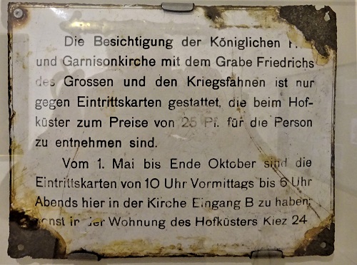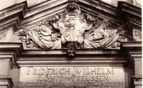 Das unter der Regierung des preußischen Soldatenkönigs Friedrich Wilhelm I. von 1731 bis 1735 nach Plänen von Philipp Gerlach erbaute Gotteshaus besaß innen und außen einen reichem, seine Funktion als Hof- und Garnisonkirche unterstreichenden Skulpturenschmuck. In preußisch-deutschen Kriegen eroberte Fahnen waren ein exklusiver Schmuck und dienten der preußisch-deutschen Traditionspflege. Viele Fahnen stammen aus dem Bestand des in der Nähe stationierten 1. Garderegiments zu Fuß, das nach dem Ende der Monarchie in Infanterieregiment 9 umbenannt wurde. Wer auf dem Kasernenhof in der Priesterstraße, der heutigen Henning-von-Tresckow-Straße, exerzierte, hatte immer den Turm der Garnisonkirche im Blick (siehe Eintrag auf dieser Seite vom 8. Juli 2019).