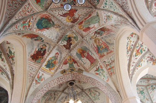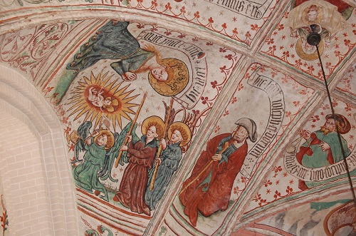 Eine wichtige Vorraussetzung für die Entwicklung der Stadt war die Gründung des Augustiner - Barfüßerklosters und des Nonnenklosters um 1200. Der Bau der berühmten Nikolaikirche, die seit der Reformation Marienkirche heißt und das Wahrzeichen der Stadt ist, machte Herzberg zu einem Zentrum des Kirchenlebens im Elstergebiet. Bereits 1522 wurde in dem Gotteshaus der protestantische Gottesdienst in deutscher Sprache eingeführt. Die dreischiffige spätgotische Backsteinhalle besitzt in den Feldern des Netz- und Sterngewölbes besonders kostbare Ausmalungen, für deren Erhalt sich im 19. Jahrhundert kein Geringerer als der berühmte Baumeister Karl Friedrich Schinkel und Preußens erster Denkmalpfleger Ferdinand von Quast eingesetzt haben. Mehrfach restauriert, zeigen die nach böhmischen Vorbildern ausgeführten Deckenbilder Szenen und Personen aus der Bibel sowie Pflanzen und Ornamente. Schriftrollen, die die Figuren in den Händen halten, erläutern, wen und was sie darstellen. Da im Mittelalter die meisten Menschen weder lesen noch schreiben konnten und auch nicht der im Gottesdienst verwendeten lateinischen Sprache nicht mächtig waren, hat man die Bilder als so etwas wie heilige Lehrer verehrt. Zu sehen sind auch kursächsische Wappenschilder, die die Zugehörigkeit der Stadt zum Reich der Wettiner unterstreichen. Diese endete 1815 durch Einverleibung größerer Landesteile einschließlich Herzbergs in das preußische Königreich.