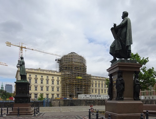 Vielleicht kann der Museumsbau am 251. Geburtstag von Alexander von Humboldt am 14. September 2020 von neugierigen Besuchern betreten werden? Vorn scheint Karl Friedrich Schinkel, auf hohem Denkmalsockel stehend, auf den feierlichen Moment zu warten.