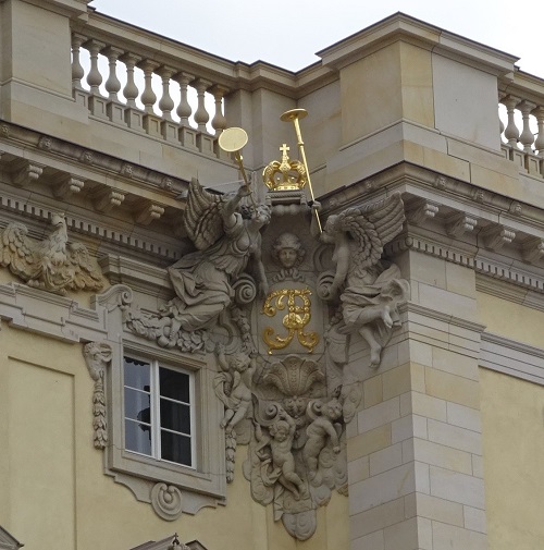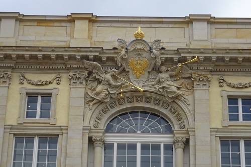 Allen Querelen zum Trotz haben talentierte Bildhauer bei der Kopie verlorener Skulpturen ganze Arbeit geleistet, hier der prunkvoll dekorierte Preußenadler über einem der Schlossportale sowie die Kartusche mit dem Monogramm FR (FRIDERICUS REX) für Friedrich I., der im frühen 18. Jahrhundert die Residenz barock aus- und umbauen ließ.