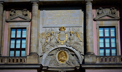 Wie solche Inschriften ausgesehen haben und welchen Zweck sie hatten, kann man gut am Portal des Zeughauses Unter den Linden sehen, wo über dem vergoldeten Brustbild des gleichen Königs eine achtzeilige lateinische Inschrift prangt, die in deutscher Übersetzung verkündet: "Für die Gerechtigkeit durch Waffen, für die Abschreckung der Feinde, für den Schutz der eigenen Völker und der Verbündeten hat Friedrich I., König in Preußen, Vater des Vaterlandes, fromm, erhaben, unbesiegt, dieses Zeughaus, das mit aller Art Kriegsgerät sowie mit Kriegsbeute und Trophäen angefüllt ist, vom Fundament her erbauen lassen 1706". Besucher des Deutschen Historischen Museums können nicht nur die Bauinschrift betrachten, sondern darüber auch das vergoldete Bildnis des Bauherren, der das Waffenarsenal, auch Zeughaus genant, von Andreas Schlüter und anderen Architekten errichten und prachtvoll ausstatten ließ.