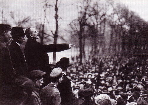 Im Dezember 1914 stimmte der Abgeordnete im Reichstag als einziger gegen die kaiserlichen Kriegskredite, womit er seine Partei und seine Parlamentskollegen gegen sich aufbrachte. Die SPD-Führung hatte sich, vom nationalen Kriegstaumel mitgerissen, in Abkehr früherer Beschlüsse und ganz im Sinne des vom Kaiser Wilhelm II. geforderten "Burgfriedens" für die Kriegskredite ausgesprochen hatten. Unbeirrt agitierte Liebknecht als einfacher Armierungssoldat an der West- und Ostfront weiter gegen den Völkermord, stellte in einem Flugblatt "Der Hauptfeind steht im eigenen Land" fest und forderte "Burgkrieg, nicht Burgfriede!" 1916 erneut wegen Hochverrats verurteilt, saß er seine Haft im Zuchthaus Luckau ab, kam aber im Oktober 1918 auf Grund einer Amnestie wieder frei. Nach Berlin zurückgekehrt, war er einer der Organisatoren der revolutionären Erhebung im November 1918, in deren Ergebnis der Kaiser und die anderen deutschen Fürsten abdankten mussten. Karl Liebknecht verkündete am 9. November 1918 vom Balkon des Berliner Schlosses die "sozialistische" Republik, während der SPD-Politiker Philipp Scheidemann vom Reichstagsgebäude hingegen die freie, deutsche Republik ausrief.