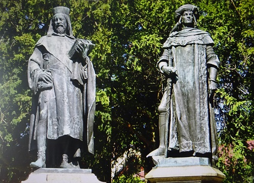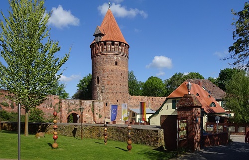 Zwei Herrscher des Mittelalters - der römisch-deutsche Kaiser Karl IV. und der brandenburgische Kurfürst Friedrich I. - halten vor der Burg zu Tangermünde Wache. Ehemals in der brandenburgischen Altmark gelegen, gehört die frühere Residenz- und Hansestadt jetzt zu Sachsen-Anhalt. Die Figuren sind Bronzeabgüsse zweier Standbilder aus Marmor, die Kaiser Wilhelm II. im Jahr 1900 für die Siegesallee in Berlin zum Ruhm des brandenburgisch-preußischen Herrscherhauses fertigen ließ. Dass die Herrscherfiguren auf einer Grünanlage im Tangermünder Burgbezirk hoch über der Elbe stehen, hat gute Gründe. Kaiser Karl IV., den Ludwig Cauer im Jahr 1900 mit dem Brandenburgischen Landbuch in der Hand darstellt, ließ 1375 in einem Landbuch zahlreiche Städte und Ortschaften erfassen, deren heutige Jubiläen sich vielfach auf die Erwähnung in dieser erstklassigen Quelle märkischer Siedlungsgeschichte beziehen.
