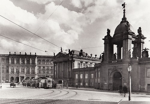 Während sich Kurfürst Friedrich III. im Winter 1700/1 auf den Weg nach Königsberg machte, um sich zum König "in" Preußen zu krönen, errichtete man am Potsdamer Stadtschloss nach Plänen des Holländers Jean de Bodt ein prächtiges Triumphtor, durch das der Monarch, der sich jetzt Friedrich I. nannte, nach seiner feierlichen Rückkehr zog. Während die aus Gips, Holz und Pappe gefügten Triumphtore in Berlin nicht erhalten sind, erinnerte bis 1960 das Potsdamer Fortunaportal an die feierliche Heimholung des prunkliebenden Herrschers. Sein Enkel Friedrich II. schätzte den Säulenbau mit der vergoldeten Glücksgöttin so sehr, dass er seinem Architekten Knobelsdorff befahl, es beim Umbau des alten Stadtschlosses stehen zu lassen. Das Fortunaportal wurde in traditioneller Bauweise gemauert, Ziegel auf Ziegel, im Fundamentbereich auch unter Verwendung von Feldsteinen, wie man sie auch bei den Mauerresten des Berliner Schlosses nachgewiesen hat, das 2020, nach einer Terminverschiebung, nun endlich als Humboldt Forum eröffnet werden soll.