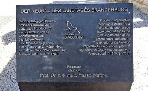 Vom Potsdamer Stadtschloss, das mit großen Teilen der Innenstadt am 14. April 1945 einem britischen Luftangriff zum Opfer fiel und 1960 gegen den Widerstand von Einwohnern dem Erdboden gleich gemacht wurde, blieben erhebliche und für den Wiederaufbau verwertbare Reste erhalten. Mit Entwurfsplänen aus der Zeit Friedrichs des Großen, der 1744/45 seinen Baumeister Georg Wenzeslaus von Knobelsdorff mit dem repräsentativen Umbau des Palastes beauftragt hatte, sowie Messbildaufnahmen von 1910 und anderen in der Plankammer der Preußischen Schlösserstiftung befindlichen Dokumenten ist die Baugeschichte der königlichen Residenz hervorragend dokumentiert. Aufgrund der Quellen war der Wiederaufbau möglich, und begonnen wurde er vor 20 Jahren mit dem Fortunaportal. Namhafte Sponsoren wie der Moderator Günter Jauch und der Gründer des Softwareunternehmens SAP und Mäzen Hasso Plattner unterstützten mit erheblichen Summen den Wiederaufbau des Schlosses, das seit 2014 als Landtagsgebäude genutzt wird. Eine Gedenktafel vor der Lustgartenseite hebt Plattners bürgerschaftliche Engagement in deutscher und englischer Sprache lobend hervor.