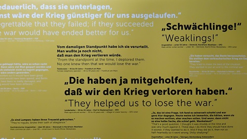 Es hat nach dem Ende der NS-Herrschaft lange, sehr lange gedauert, bis das Attentat auf Hitler allgemein als "Aufstand des Gewissens" anerkannt und nicht als Landesverrat eidbrüchiger Offiziere verteufelt wurde. Die Ausstellung zeigt an einer Wand in Pro und Contra geteilte Meinungen. Die einen nannten die "Männer des 20. Juli", wie man bis heute sagt ohne zu beachten, dass sie auch Frauen und Mitwisserinnen hatten, Verräter, Feiglinge und Schwächlinge, die ihren Eid auf Hitler gebrochen hätten. Es war auch von Fantasten, Wirrköpfen, Postenjägern und Spaltpilzen die Rede und von Leuten, die den Russen den Weg nach Deutschland geebnet hätten. Auf der anderen Seite klang in Befragungen das Bedauern dafür durch, dass Hitler am Leben blieb und den Krieg bis zum blutigen Ende fortführte.