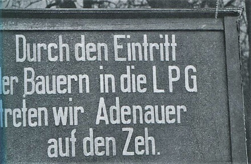Dass es mit Dingen des alltäglichen Bedarfs so schlecht bestellt war, das heißt mit Lebensmitteln, Textilien, Schuhen, Wohnraum usw., wurde von der SED und Regierung nicht mit den Mängeln der sozialistischen Planwirtschaft und schon gar nicht mit massenhaften Lieferungen an den "großen Bruder", die Sowjetunion, in Verbindung gebracht, sondern auf die noch nicht überwundenen Folgen des Zweiten Weltkriegs sowie mangelhafte Arbeitsdisziplin in der Industrie und Landwirtschaft. Diese war das große Sorgenkind, und um ihre Leistungen zu steigern, verfügte die SED-Führung Ende der 1950-er Jahre die Bildung von Landwirtschaftlichen Produktionsgenossenschaften (LPG) nach sowjetischem Vorbild. Da alles für gut und erstrebenswert angesehen wurde, was die Sowjetunion tut, sollte die Kollektivierung auf dem Lande alle Probleme lösen und dem zweiten deutschen Staat zu Wohlstand "besser als in Westdeutschland" verhelfen.