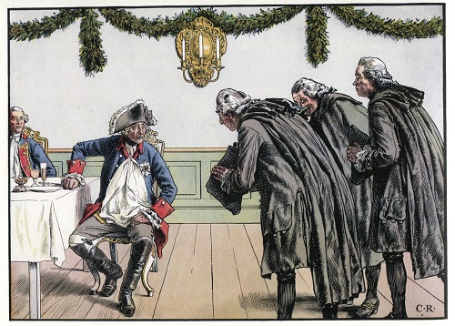 Friedrich der Große, wie man ihn 1745 nach dem zweiten Schlesischen Krieg (1742-1745) nannte, war viel unterwegs. Nichts entging seinem kritischen Blick, und wenn er bei seinen Inspektionsreisen Schlendrian und Ungerechtigkeiten entdeckte oder zu sehen glaubte, konnte der König sehr ungehalten werden. Als oberstem Richter des Landes war es ihm ein großes Anliegen, das bis zum Ende der Regierungszeit seines Vaters Friedrich Wilhelm I. von richterlicher Willkür und Korruption geprägte und außerdem viel zu schwerfällige Justizwesen zu reformieren und dort, ab er nicht nur dort, Gesetzestreue, Ordnung und Übersicht zu erlangen. Eine seiner ersten Amtshandlungen war die Abschaffung der Folter bis auf wenige Fälle und die Beschränkung der Todesstrafe auf Majestätsverbrechen, Landesverrat, Brandstiftung und ähnlich schwere Straftaten. Zu seinem Ärger musste sich der König mehrfach in Verfahren und Urteilen eingreifen, die seinem Gerechtigkeitsempfinden widersprachen, und so setzte es dann und wann Strafen, wenn er meinte, dass Richter die Gesetze missachten und ihre Stellung zum eigenen Nutzen und zugunsten ihrer Freunde missbrauchen.