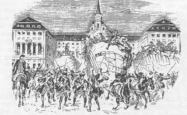 Mitten in diesem letzten und entscheidenden Krieg um die zum österreichischem Herrschaftsgebiet gehörenden schlesischen Herzogtümer war die aus Sachsen, Russen und Österreichern bestehende Militärallianz bis nach Berlin und in das Schloss Charlottenburg vorgedrungen, eine der vielen Residenzen Friedrichs II. Die fremden Soldaten fügten dem königlichen Schlossbesitzer schmerzhafte Verluste durch Kunstraub und Vandalismus zu. Sie taten allerdings nur das gleiche, was sich preußische Soldaten schon vorher in Sachsen erlaubt hatten, Befehle von ganz oben, also vom König selbst, ausführend.